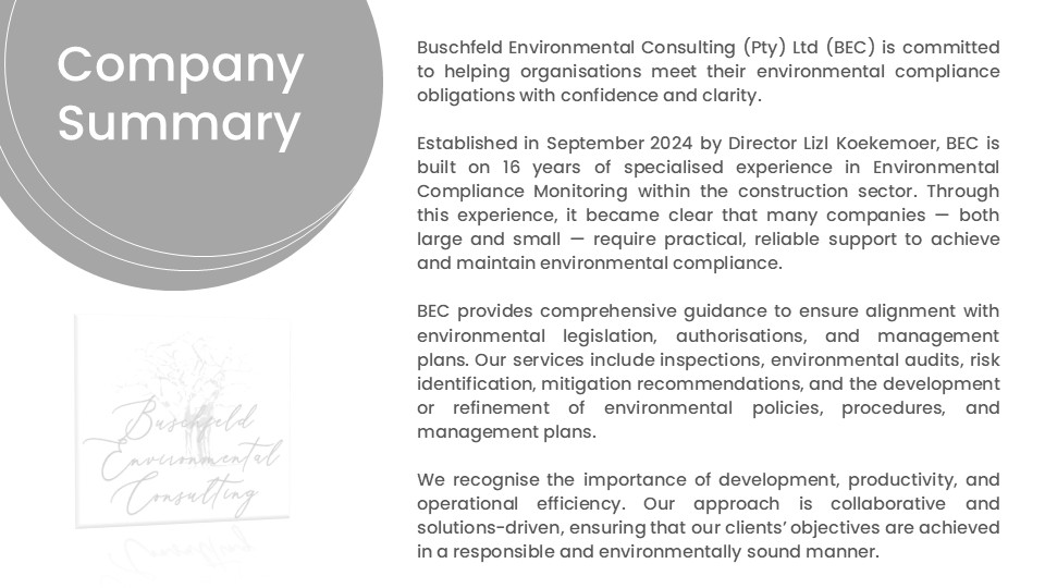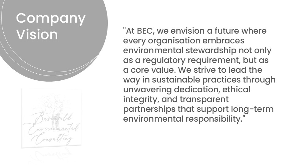 At Buschfeld Environmental Consulting, our expertise lies in guiding organizations through the complexities of environmental compliance, ensuring you meet legislative requirements without compromising on productivity.