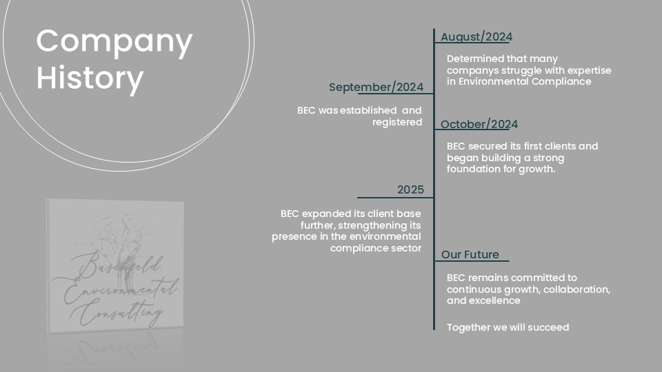 Buschfeld Environmental Consulting (BEC) is committed to helping organizations confidently meet their environmental compliance obligations. With over 16 years of specialized experience, we provide practical and reliable support tailored to your needs.